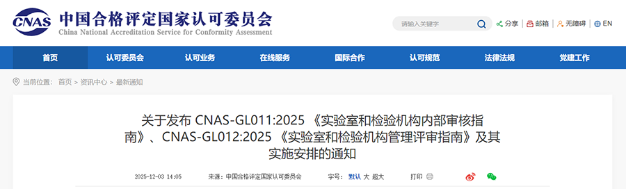 关于发布 CNAS-GL011:2025 《实验室和检验机构内部审核指南》、CNAS-GL012:2025 《实验室和检验机构管理评审指南》及其实施安排的通知